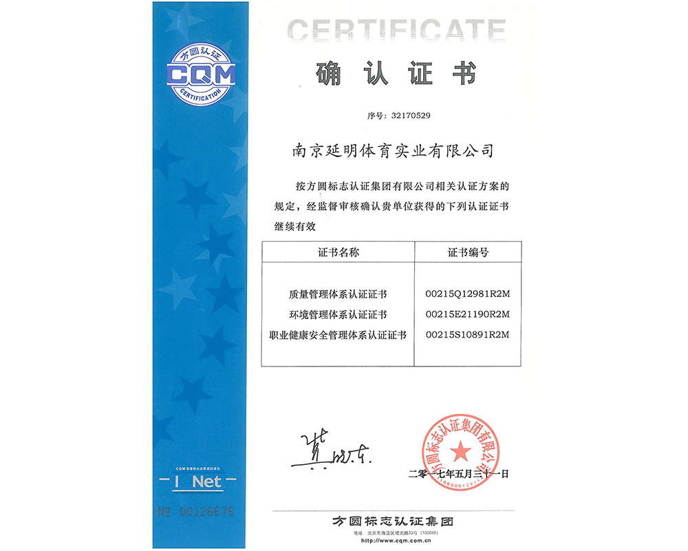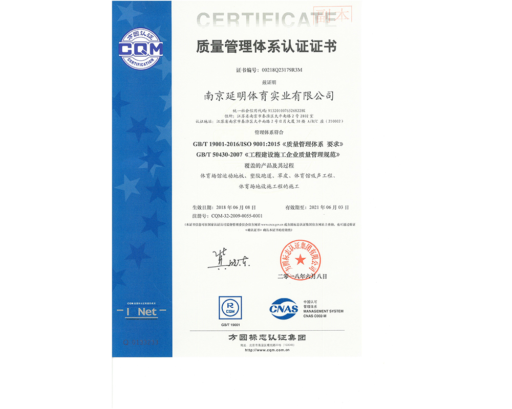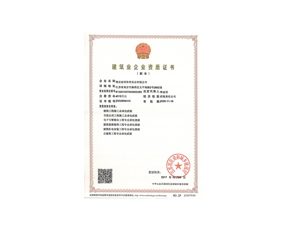 作为江苏省体育产业示范单位,九游(中国)体育拥有多年相关工程总承包施工经验,取得建筑工程施工总承包二级、古建筑工程专业承包二级、建筑装修装饰工程专业承包一级、电子与智能化工程专业承包一级、市政公用工程施工总承包二级资质;通过ISO 9001:2015质量管理体系认证;通过ISO14001:2015环境管理体系认证;通过IOS45001:2018职业健康安全管理体系认证。